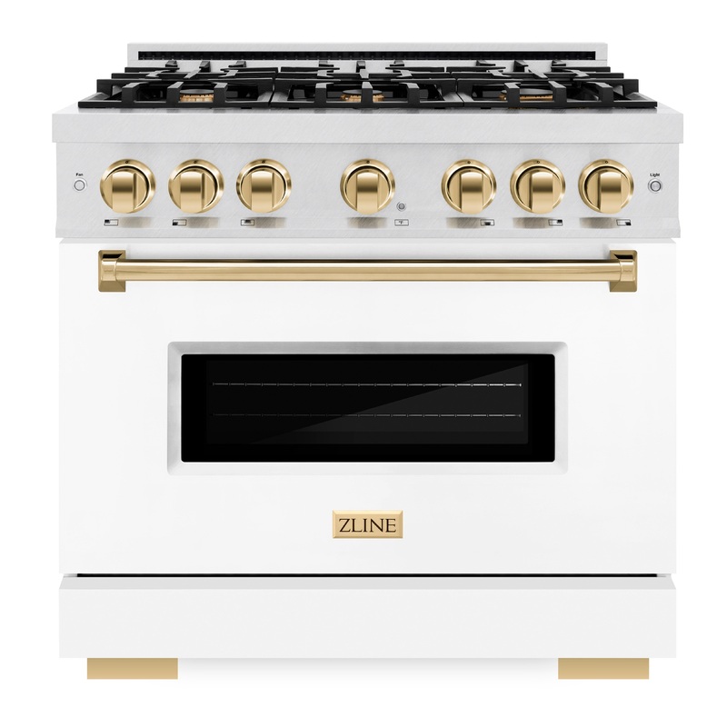 Luxury isnt meant to be left desiredits meant to be attainable. The ZLINE Autograph Edition 36 in. 5.2 cu. ft. Classic Gas Range with 6 Burner Cooktop and Convection Gas Oven in Satin Stainless Steel with White Matte Door and Polished Gold Accents (CGRSZ-WM-36-G) combines the elegance of a hand-finished porcelain gas cooktop with 6 Italian-made auto-reignition burners, a gas convection oven with an energy-efficient cooling fan to ensure quiet operation, a beautiful white matte door with a Landscape window design, and stunning polished gold knobs and handle allowing you to master every meal. With a modern, timeless style and refined functionality, ZLINE Classic Gas Ranges are masterfully crafted to deliver an elevated culinary experience.