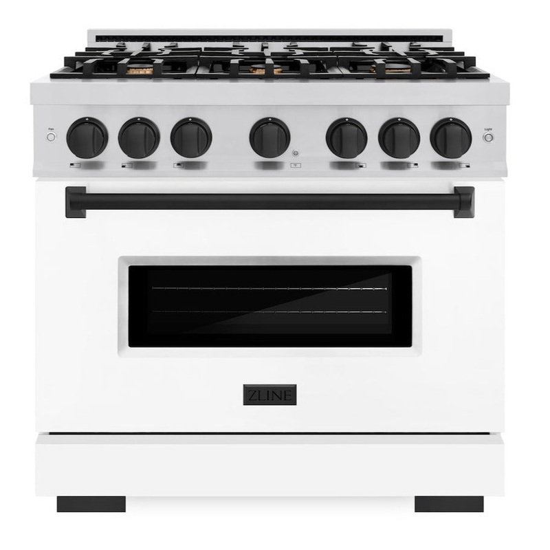 Luxury isn’t meant to be desired – it’s meant to be attainable. The ZLINE Autograph Edition 36 in. 5.2 cu. ft. Classic Gas Range with 6 Burner Cooktop and Convection Gas Oven in Stainless Steel with White Matte Door and Matte Black Accents (CGRZ-WM-36-MB) combines the elegance of a hand-finished porcelain gas cooktop with 6 Italian-made auto-reignition burners, a gas convection oven with an energy-efficient cooling fan to ensure quiet operation, a beautiful white matte door with a Landscape window design, and stunning matte black knobs and handle allowing you to master every meal. With a modern, timeless style and refined functionality, ZLINE Classic Gas Ranges are masterfully crafted to deliver an elevated culinary experience.
