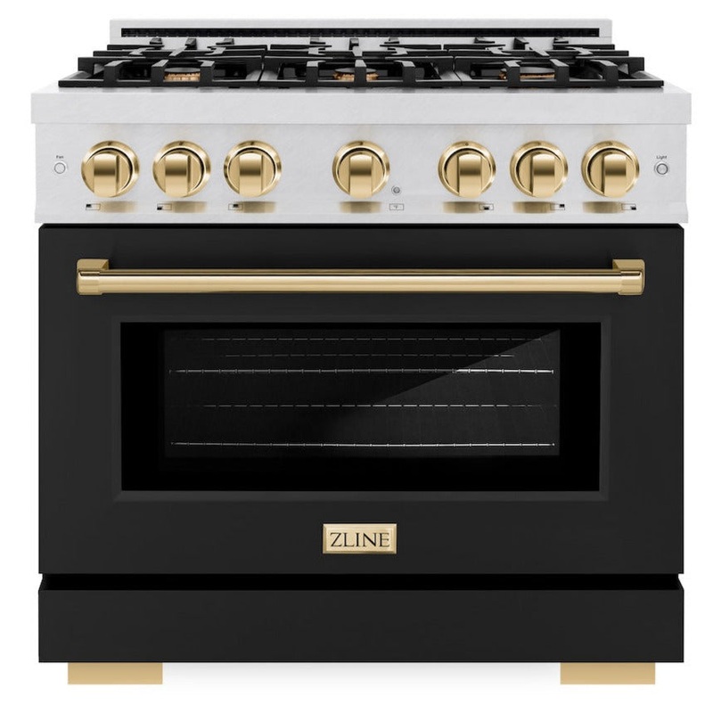 Luxury isnt meant to be left desiredits meant to be attainable. The ZLINE Autograph Edition 36 in. 5.2 cu. ft. Select Dual Fuel Range with 6 Burner Gas Cooktop and Electric Convection Oven in Satin Stainless Steel with Black Matte Door and Polished Gold Accents (HDRSZ-BLM-36-G) combines the elegance of a hand-finished porcelain gas cooktop with 6 Italian-made auto-reignition burners, an electric convection oven with an energy-efficient cooling fan to ensure quiet operation, a beautiful black matte door with a Horizon window design, and stunning polished gold knobs and handle allowing you to master every meal. With a modern, timeless style and refined functionality, ZLINE Select Dual Fuel Ranges are masterfully crafted to deliver an elevated culinary experience.