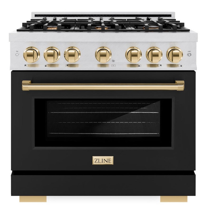 Luxury isnt meant to be left desiredits meant to be attainable. The ZLINE Autograph Edition 36 in. 5.2 cu. ft. Select Gas Range with 6 Burner Cooktop and Convection Gas Oven in Satin Stainless Steel with Black Matte Door and Polished Gold Accents (HGRSZ-BLM-36-G) combines the elegance of a hand-finished porcelain gas cooktop with 6 Italian-made auto-reignition burners, a gas convection oven with an energy-efficient cooling fan to ensure quiet operation, a beautiful black matte door with a Horizon window design, and stunning polished gold knobs and handle allowing you to master every meal. With a modern, timeless style and refined functionality, ZLINE Select Gas Ranges are masterfully crafted to deliver an elevated culinary experience.