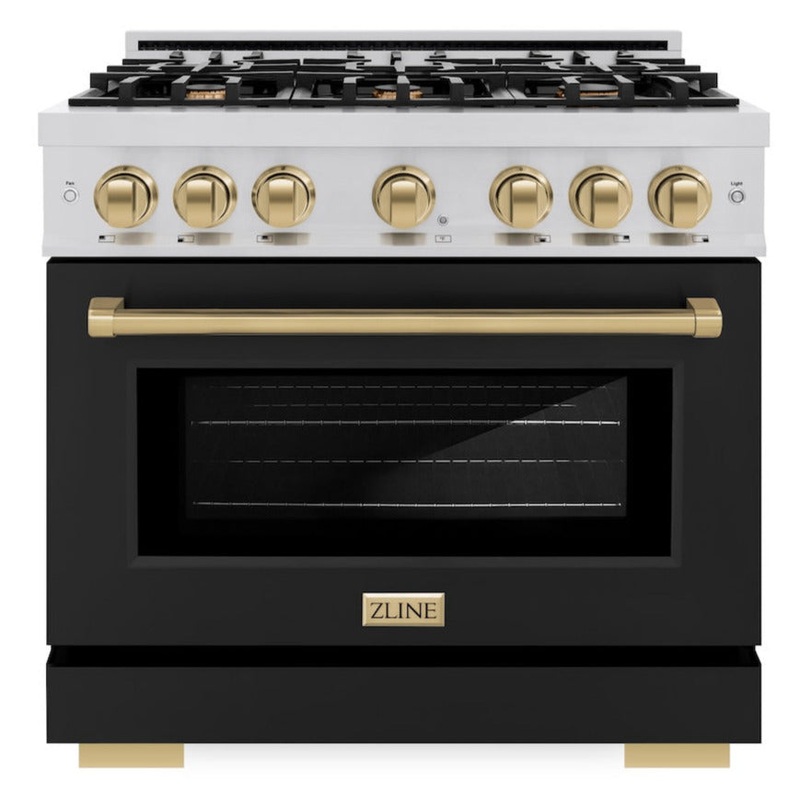 Luxury isn't meant to be desired - it's meant to be attainable. The ZLINE Autograph Edition 36 in. 5.2 cu. ft. Select Gas Range with 6 Burner Cooktop and Convection Gas Oven in Stainless Steel with Black Matte Door and Champagne Bronze Accents (HGRZ-BLM-36