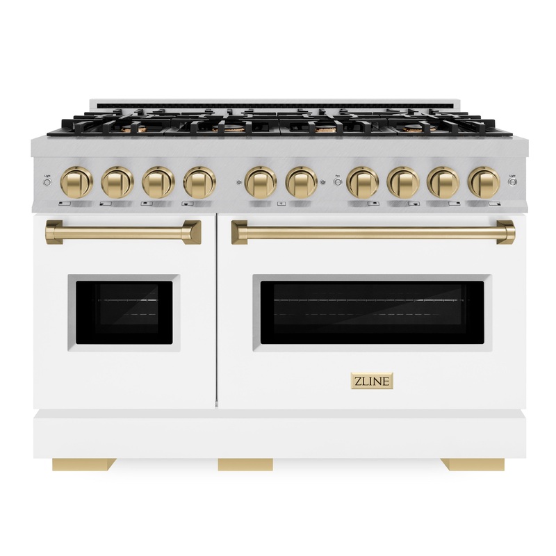 Luxury isnt meant to be left desiredits meant to be attainable. The ZLINE Autograph Edition 48 in. 6.7 cu. ft. Classic Double Oven Dual Fuel Range with 8 Burner Gas Cooktop in Satin Stainless Steel with White Matte Doors and Champagne Bronze Accents (CDRSZ-WM-48-CB) combines the elegance of a hand-finished porcelain gas cooktop with 8 Italian-made auto-reignition burners, a large electric convection oven with an energy-efficient cooling fan to ensure quiet operation, a small bake-and-broil oven, beautiful white matte doors with Landscape window designs, and stunning champagne bronze knobs and handles allowing you to master every meal. With a modern, timeless style and refined functionality, ZLINE Classic Dual Fuel Ranges are masterfully crafted to deliver an elevated culinary experience.