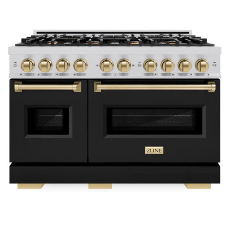 Luxury isn’t meant to be desired – it’s meant to be attainable. The ZLINE Autograph Edition 48 in. 6.7 cu. ft. Classic Double Oven Gas Range with 8 Burner Cooktop in Stainless Steel with Black Matte Doors and Champagne Bronze Accents (CGRZ-BLM-48-CB) combines the elegance of a hand-finished porcelain gas cooktop with 8 Italian-made auto-reignition burners, a large gas convection oven with an energy-efficient cooling fan to ensure quiet operation, a small baking oven, beautiful black matte doors with Landscape window designs, and stunning champagne bronze knobs and handles allowing you to master every meal. With a modern, timeless style and refined functionality, ZLINE Classic Gas Ranges are masterfully crafted to deliver an elevated culinary experience.