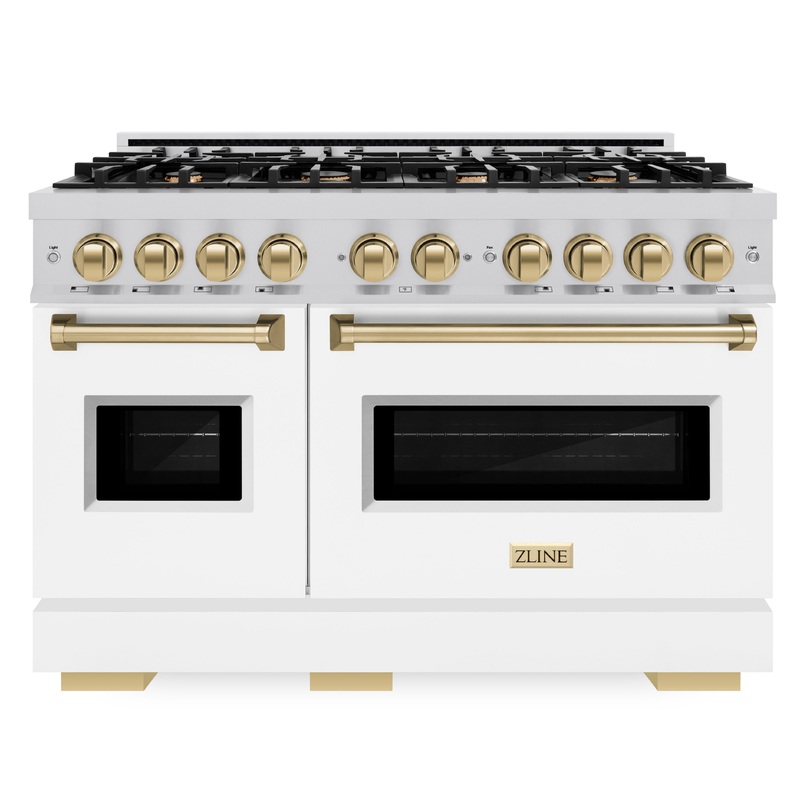 Luxury isn’t meant to be desired – it’s meant to be attainable. The ZLINE Autograph Edition 48 in. 6.7 cu. ft. Classic Double Oven Gas Range with 8 Burner Cooktop in Stainless Steel with White Matte Doors and Champagne Bronze Accents (CGRZ-WM-48-CB) combines the elegance of a hand-finished porcelain gas cooktop with 8 Italian-made auto-reignition burners, a large gas convection oven with an energy-efficient cooling fan to ensure quiet operation, a small baking oven, beautiful white matte doors with Landscape window designs, and stunning champagne bronze knobs and handles allowing you to master every meal. With a modern, timeless style and refined functionality, ZLINE Classic Gas Ranges are masterfully crafted to deliver an elevated culinary experience.