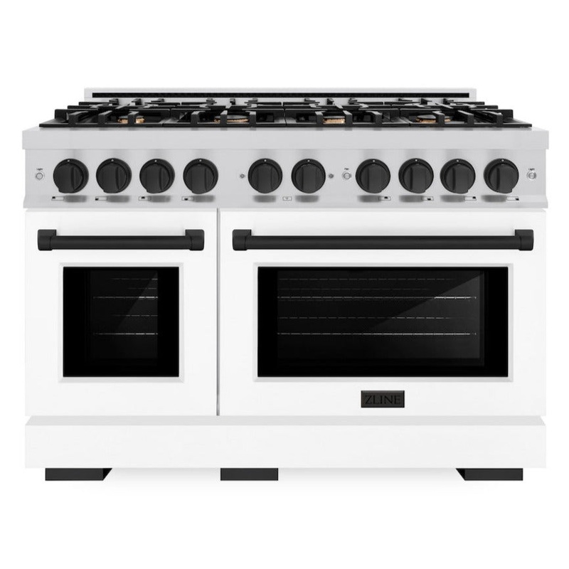 Luxury isn’t meant to be desired – it’s meant to be attainable. The ZLINE Autograph Edition 48 in. 6.7 cu. ft. Select Double Oven Dual Fuel Range with 8 Burner Gas Cooktop in Stainless Steel with White Matte Door and Matte Black Accents (HDRZ-WM-48-MB) combines the elegance of a hand-finished porcelain gas cooktop with 8 Italian-made auto-reignition burners, a large electric convection oven with an energy-efficient cooling fan to ensure quiet operation, a small bake-and-broil oven, beautiful white matte doors with Horizon window designs, and stunning matte black knobs and handles allowing you to master every meal. With a modern, timeless style and refined functionality, ZLINE Select Dual Fuel Ranges are masterfully crafted to deliver an elevated culinary experience.