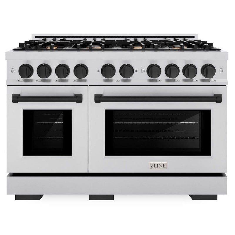 Luxury isn’t meant to be desired – it’s meant to be attainable. The ZLINE Autograph Edition 48 in. 6.7 cu. ft. Select Double Oven Gas Range with 8 Burner Cooktop in Stainless Steel and Matte Black Accents (HGRZ-48-MB) combines the elegance of a hand-finished porcelain gas cooktop with 8 Italian-made auto-reignition burners, a large gas convection oven with an energy-efficient cooling fan to ensure quiet operation, a small baking oven, Horizon oven door window designs, and stunning matte black knobs and handles allowing you to master every meal. With a modern, timeless style and refined functionality, ZLINE Select Gas Ranges are masterfully crafted to deliver an elevated culinary experience.