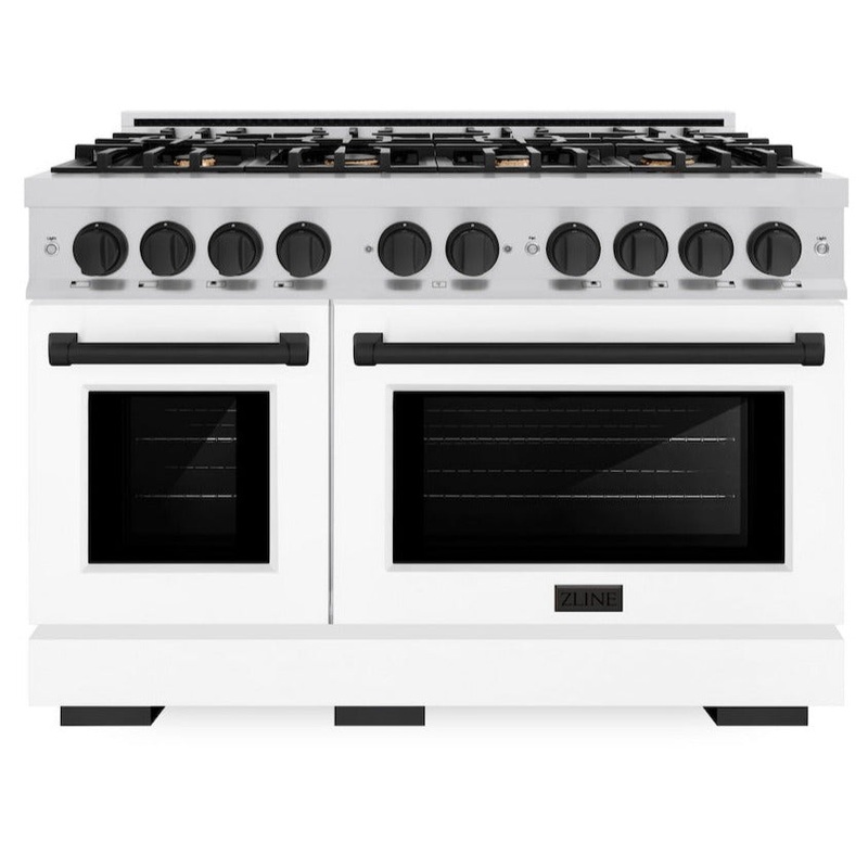 Luxury isn't meant to be desired - it's meant to be attainable. The ZLINE Autograph Edition 48 in. 6.7 cu. ft. Select Double Oven Gas Range with 8 Burner Cooktop in Stainless Steel with White Matte Doors and Matte Black Accents (HGRZ-WM-48-MB) combines the