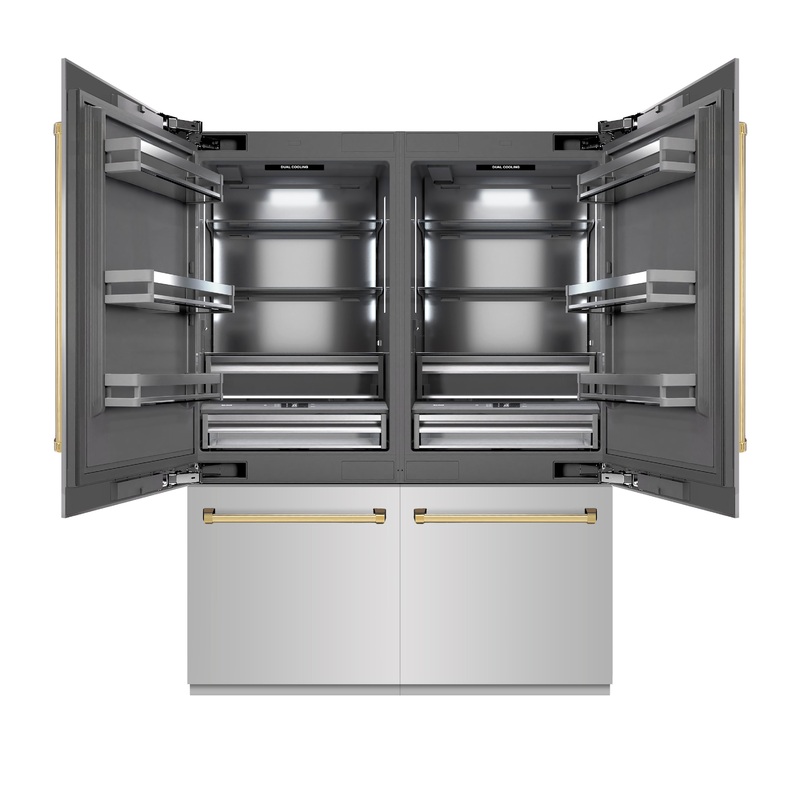 Luxury isn’t meant to be desired – it’s meant to be attainable. The ZLINE Autograph Edition 60″ 32.2 cu. ft. French Door Built-In Bottom Freezer Refrigerator with Water Dispenser and Ice Maker in Stainless Steel with Graphite Gray Interior and Polished Gold Accents (GRBIVZ-304-60G) provides the ultimate upgrade to the center of your home by pairing premium dual cooling technology with enhanced storage capacity for multiple grocery items. Achieve ZLINE Attainable Luxury excellence with innovative features designed to enhance your kitchen’s cooling and freezing capability.