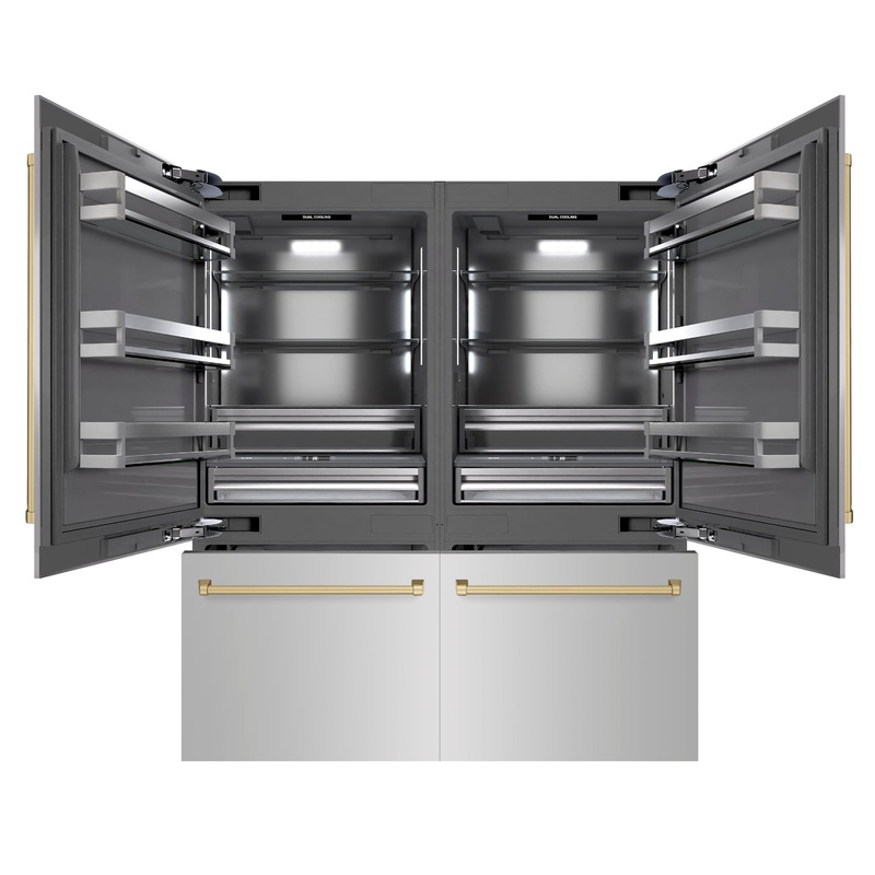 Luxury isn't meant to be desired - it's meant to be attainable. The ZLINE Autograph Edition 72" 39.6 cu. ft. French Door Built-In Bottom Freezer Refrigerator with Water Dispensers and Ice Makers in Stainless Steel with Graphite Gray Interior and Champagne
