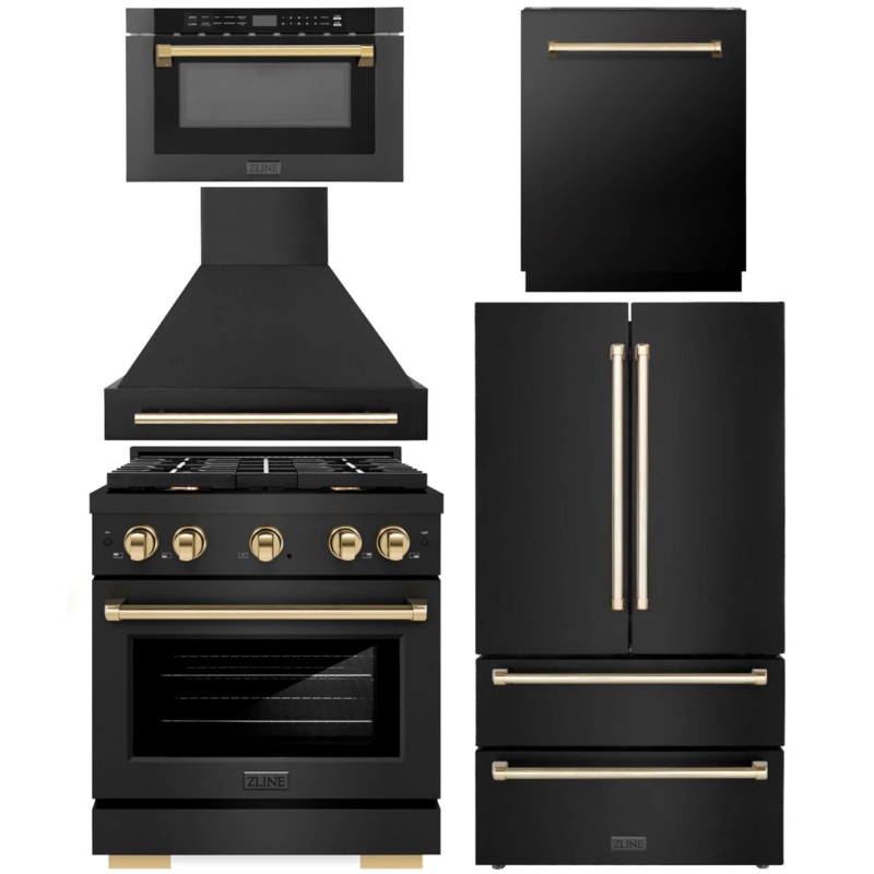 OO621835297440ZLINE Autograph Appliance Package – 30″ Gas Range, Range Hood, 36″ Refrigerator with Ice Maker, 24″ Microwave Drawer and Dishwasher in Black Stainless Steel with Polished Gold Accents
