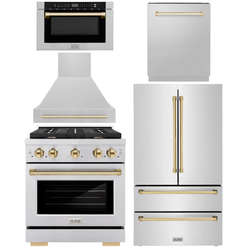 ZLINE Autograph Appliance Package – 30″ Gas Range, Range Hood, 36″ Refrigerator with Ice Maker, 24″ Microwave Drawer and Dishwasher in Stainless Steel with Polished Gold Accents