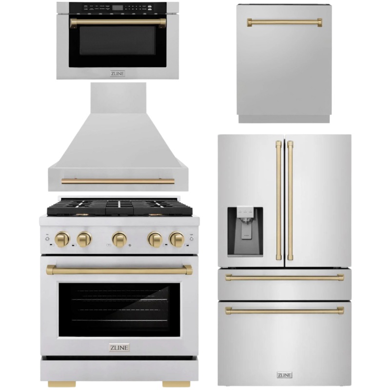 ZLINE Autograph Appliance Package – 30″ Gas Range, Range Hood, 36″ Refrigerator with Water/Ice Dispenser, 24″ Microwave Drawer and Dishwasher in Stainless Steel with Champagne Bronze Accents