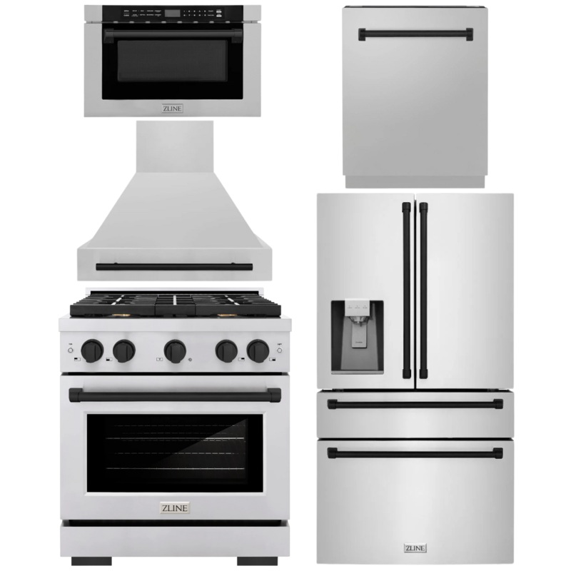 OO621835297457ZLINE Autograph Appliance Package – 30″ Gas Range, Range Hood, 36″ Refrigerator with Water/Ice Dispenser, 24″ Microwave Drawer and Dishwasher in Stainless Steel with Matte Black Accents