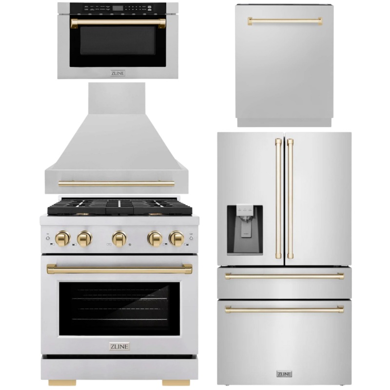 OO621835297428ZLINE Autograph Appliance Package – 30″ Gas Range, Range Hood, 36″ Refrigerator with Water/Ice Dispenser, 24″ Microwave Drawer and Dishwasher in Stainless Steel with Polished Gold Accents