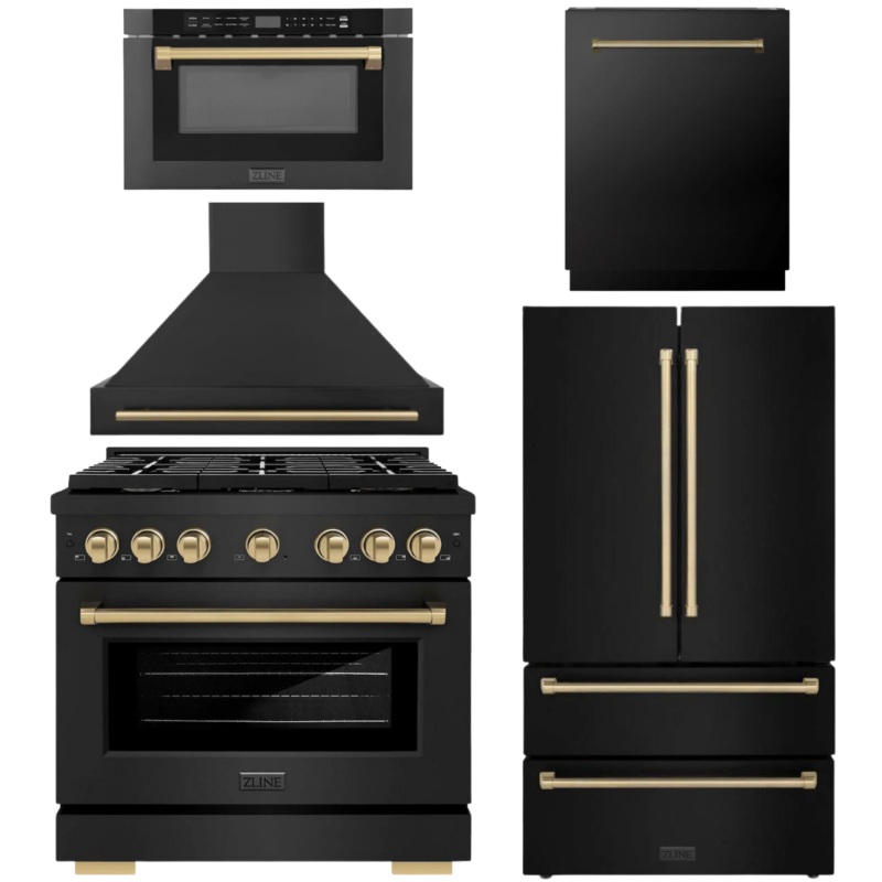 OO621835297445ZLINE Autograph Appliance Package – 36″ Gas Range, Range Hood, 36″ Refrigerator with Ice Maker, 24″ Microwave Drawer and Dishwasher in Black Stainless Steel with Champagne Bronze Accents