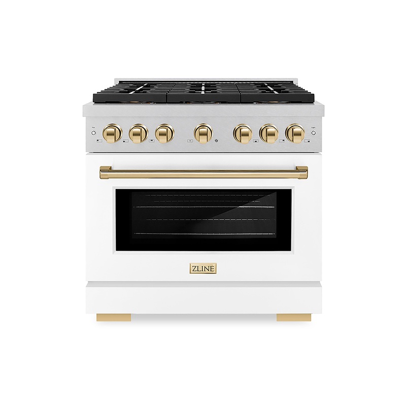 Luxury isnt meant to be left desiredits meant to be attainable. The ZLINE Autograph Edition 36 in. 5.2 cu. ft. Paramount Gas Range with 6 Burner DuoPro Cooktop and Convection Gas Oven in Satin Stainless Steel with Black Matte Door and Champagne Bronze Acce