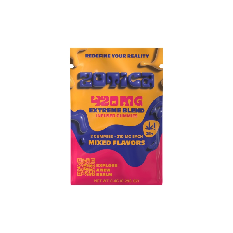 Two Zotica Extreme Blend Gummies! 2 gummies per pouch Extreme Blend THC-A, CBD, Delta 8, and Delta 9! Fast acting and very potent! Mixed flavors 420mg total 210mg each! Description Get ready for an extreme taste sensation with Zotica Extreme Blend Gummies